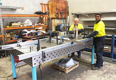 上图:同样用三维柔性平台配合气动夹具实现快速精准的装夹,减少焊接变形量,基准面用定位平尺定位,由于工件为铝制品,YP官网·(中国)集团采用镀铬产品实现。